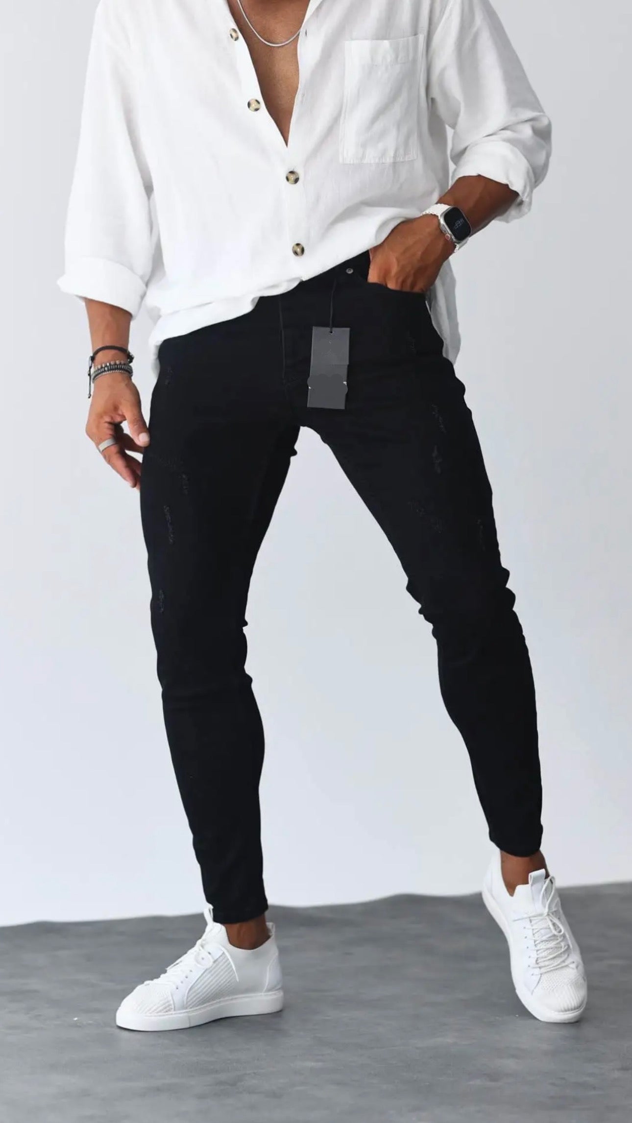 ג׳ינס סקיני איכותי בצבע שחור קלאסי עם קרעים עדינים.
